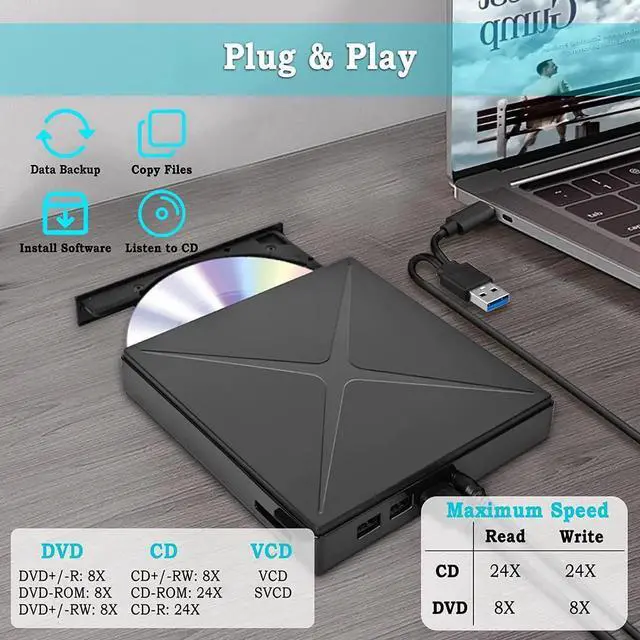 USB 3.0 & USB-C High-speed Transmission: Equipped high-speed USB 3.0 and USB-C ports, up to 5Gbps(768mb/s) and stable performance with strong error-correcting. Can also provide with maximum DVD 8x and 24x CD writing speed, and maximum DVD 8x and 24x CD reading speed.