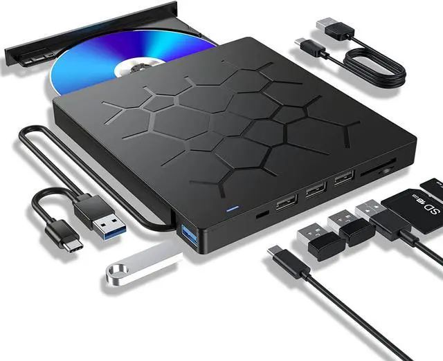 7 IN 1 Optical Drive Our portable DVD player is not only a CD/DVD reader, but also a CD/DVD burner, 4 port USB 3.0 hub, SD or TF card reader, is perfect for transferring photo and video files from your camera by cards to your computer. (Note: SD and TF card cannot be used at the same time)