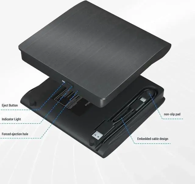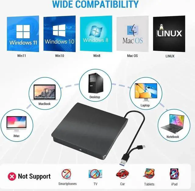 The external Blu-ray burner is very easy to use. It can read and write CD, DVD, and BD discs. Simply plug it into your laptop or desktop PC.