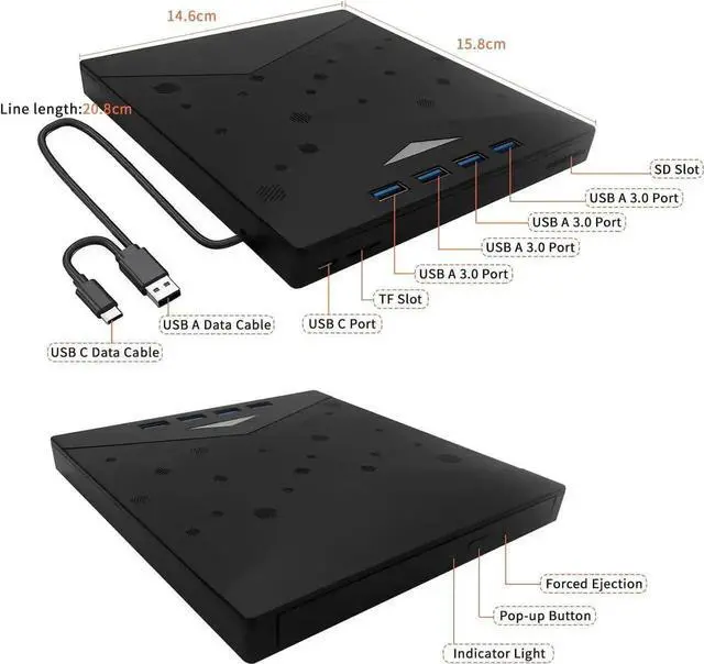 In addition to its CD and DVD capabilities, this device functions as an 8-in-1 USB hub. It offers one USB 3.0 port, three USB 2.0 ports, one TF card slot, one SD card slot, and one USB-C port. This versatile hub allows you to connect USB hard drives, wired or wireless mice and keyboards, computer cooling fans, and other USB accessories to enhance your computing experience.