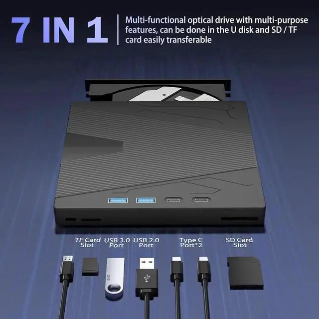 Our external CD/DVD drive for laptop contains 7 ports, 1*SD card slot, 1*TF card slot, 2*Type-C ports, 1*USB 3.0 port, 1*USB 2.0 port and a power port, you can also use it as an adapter. Copying music, movie and data files from SD card or TF card directly to PC, or transferring files from DVD player to SD card, USB hard disk or flash drive, etc. Note that SD card and TF card can't be used at the same time.