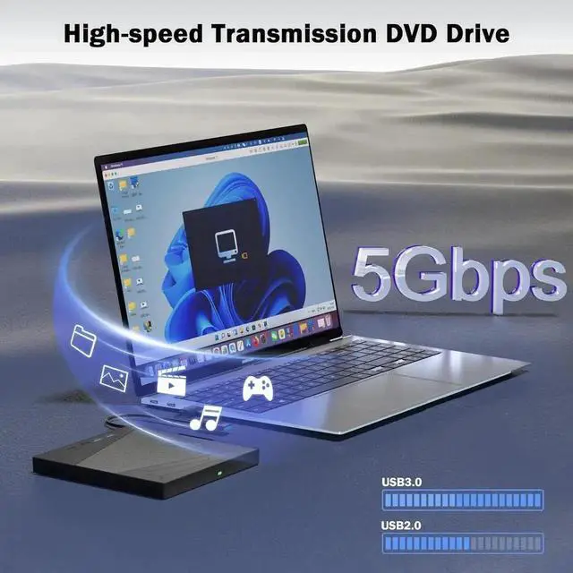 Our external DVD player for laptop is designed with a 2-in-1 transfer cable notch on the back, plug and play to avoid losing it. Equipped with advanced USB 3.0 interface, enjoy up to 5Gbps super speed, up to 8x for DVD, up to 24x for CD. The package also comes with a power cord that can be used as an extra power supply if you run out of power.