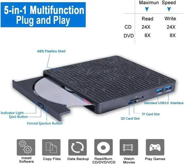 More than a DVD writer/burner,this item also has USB hub,TF&SD card reader function,it provides one TF slot,one SD slot and two USB 3.0 standard ports,each USB port can be used as standard port,Load-in line or as a charger connection.