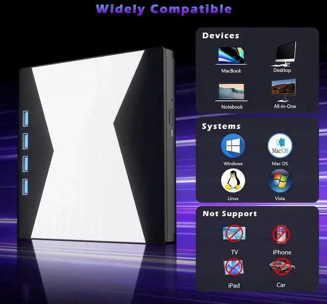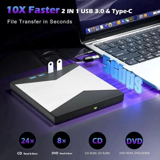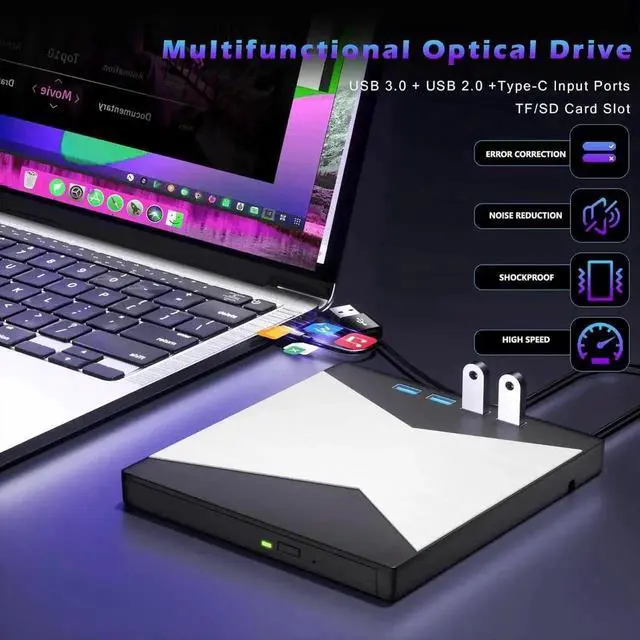 With many laptops lacking built-in CD/DVD drives, the inability to directly insert CDs or DVDs for tasks such as listening to music, watching movies, data backup, or system installations can be frustrating. We recently released external cd/dvd drive for pc provides an excellent solution to this problem. External DVD drive for PC requires no additional drivers and is a plug-and-play device. This dvd drive usb external boasts high error correction, anti-skid, and quiet capabilities.