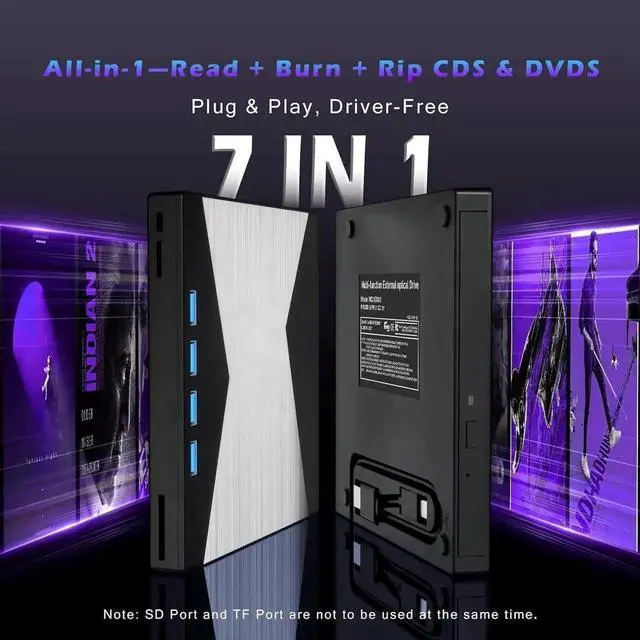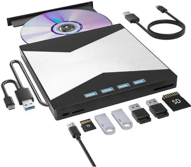 Our cd drive external usb not only functions as a CD DVD burner/reader, but also serves as an 7 in 1 USB hub for your laptop. USB cd/dvd external drive includes 1 USB 3.0 port, 3 USB 2.0 ports, 1 TF slot, 1 SD card slot. This portable cd players versatile hub is compatible with various USB devices such as USB hard drives, wireless mice & keyboards, computer radiators, and other USB computer accessories. The SD and TF card slots are perfect for transferring photo and video files from your camera to your computer.
