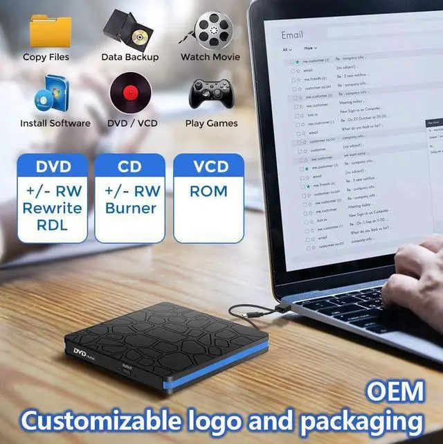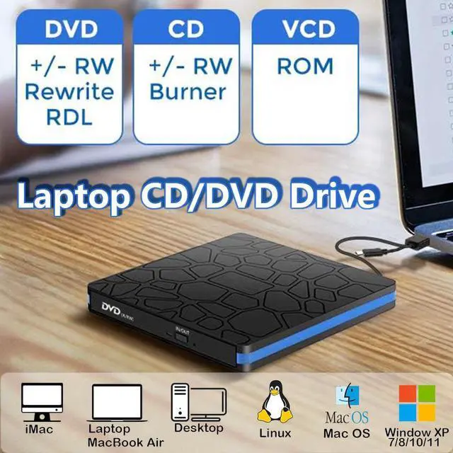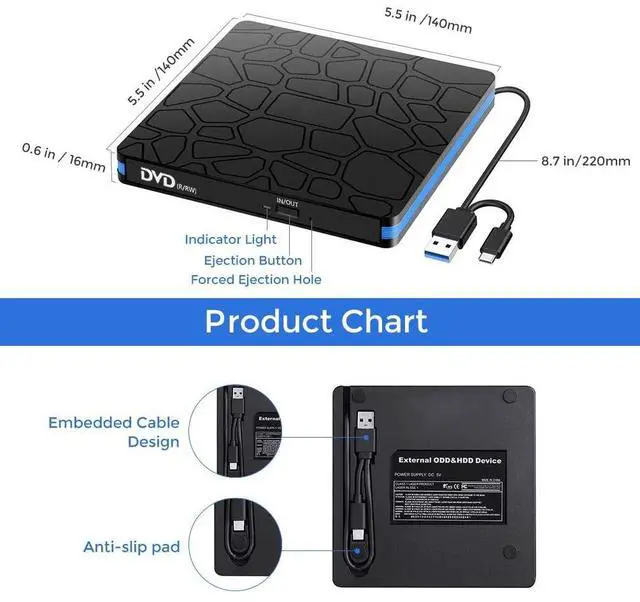 External DVD Drive, USB 3.0 & Type-C Dual Interface Portable CD/DVD Burner for Laptop & Desktop External Optical Drive for PC, Tray-Load, Plug & Play, Ultra-Slim Black edge