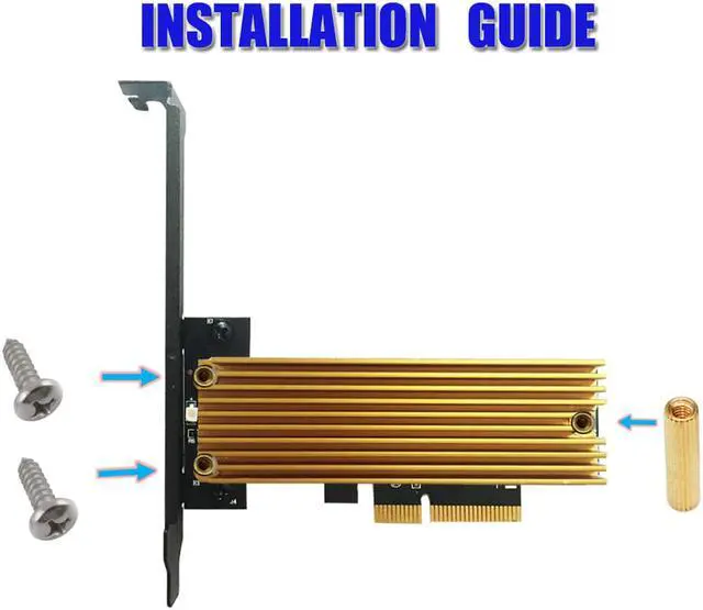 Package contents: 1. PCI express 4x to M Key adapter x1 2. Low Profile Bracket x1 3. 1x Screw Driver 4. M2 screw/nut x 2 5. heatsink x1 6. Thermal pad x1