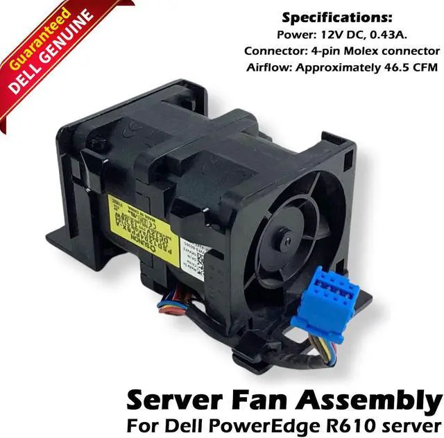 The 12V power requirement ensures compatibility with the server's power supply system, allowing the fan assembly to operate reliably within the server environment. Whether you're replacing a faulty fan or upgrading your server's cooling capabilities, the Dell PowerEdge R610 12V 40x40 Cooling Fan Assembly (0WW2YY) is the ideal solution for ensuring optimal thermal management and reliable performance in your PowerEdge R610 server.