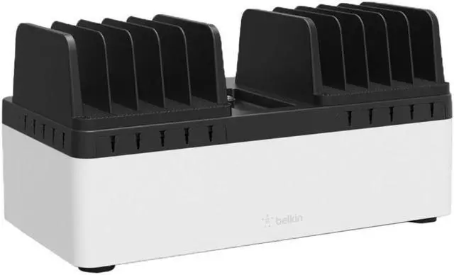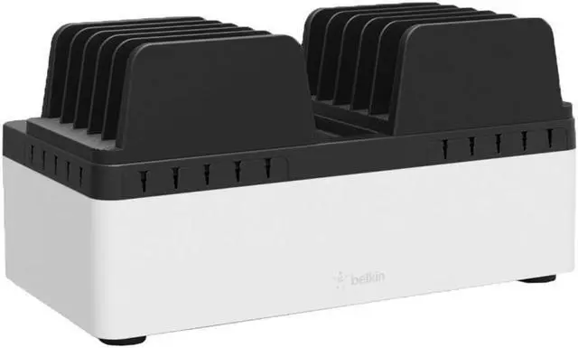 Be prepared to revolutionize your device management with the Belkin Store and Charge Go with Fixed Dividers and RockStar 10-Port USB Charger. This cutting-edge charging station is engineered to securely store and efficiently charge up to 10 devices simultaneously, making it an indispensable asset for classrooms, offices, and tech-savvy households. Its versatile design allows the base unit to be mounted on a desktop or wall, providing a space-saving solution that keeps your devices neatly organized and your workspace free from clutter.