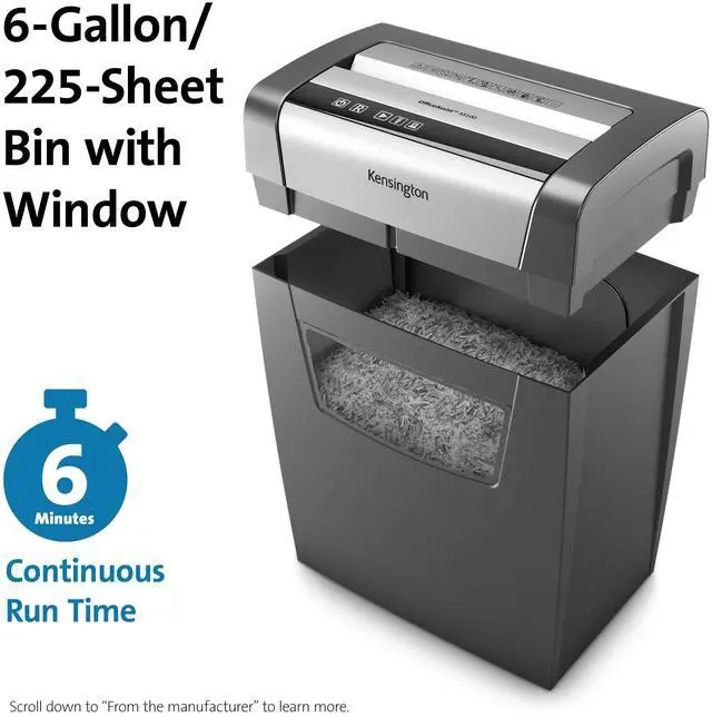 • A six-gallon/225-sheet bin with window helps shred more and empty less; The window makes it easy to know when the bin is full.