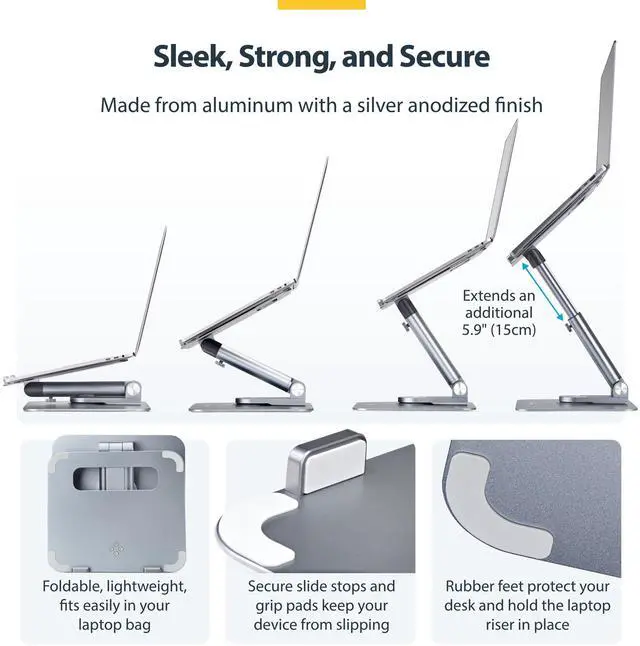 Raise a laptop to eye level for improved posture and all-day comfort - Max column extension 4.9in; Up to 11lb - 360deg swivel tray tilts at various angles - Anti-slip pads and slide stops keep the computer stable - Aluminum build