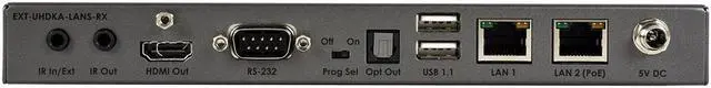 The Receiver's integrated USB hub with two USB 2.0 and two USB 1.1 ports accommodates touch panels, keyboard and mouse and a variety of supported devices. This feature, along with analog audio inputs and outputs, make these products perfect to use in collaborative and interactive installations. To ensure maximum versatility and compatibility, the audio outputs on the Receiver units are compatible with both headphones and line level devices such as powered speakers.
