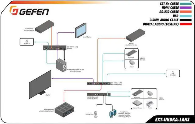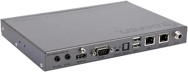 The EXT-UHDKA-LANS-TX & RX feature maximum input resolution of 4K 60 Hz 4:2:0 and maximum output resolution of 4K 30 Hz 4:4:4. HDCP 2.2 and 1.4 are also supported. 7.1 channels of HBR (High Bit Rate) lossless and LPCM digital audio can pass through the system as well. The Sender unit features a video output for local monitoring of the source. USB, RS-232 2-way IR and audio can be routed independently between any Sender and Receiver unit, allowing end-users to control any of the sources and the displays within their network. With this greatly expanded array of new cutting-edge features and performance, the new Gefen AV over IP products fully address the ever-growing needs of systems integrators.