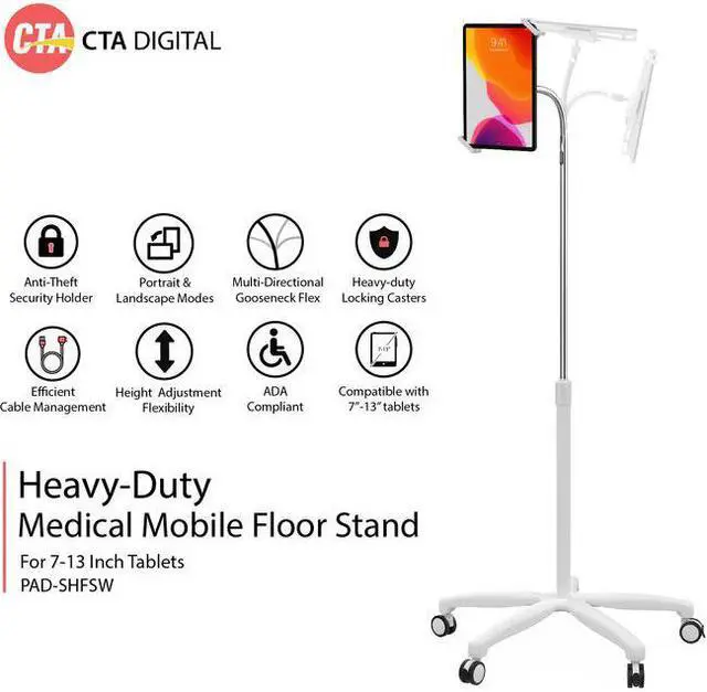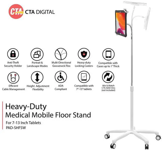 Be at the forefront of digital innovation in healthcare with CTA Digital's Heavy-Duty Security Medical Mobile Gooseneck Floor Stand. Designed to accommodate 7-13" tablets, this robust, mobile floor stand transforms any medical environment into a modern, digital workspace.