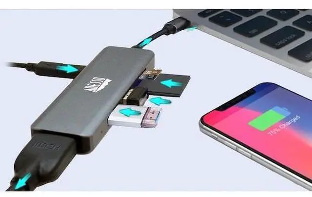 Expand your laptops connection port with this USB Type-C multi-port docking station. Its HDMI port supports transmission of 4K content to an external monitor. You can even charge other devices. This USB Type-C multi-port docking station has 2 USB 3.0 superspeed ports and SD and TF card reader slots.