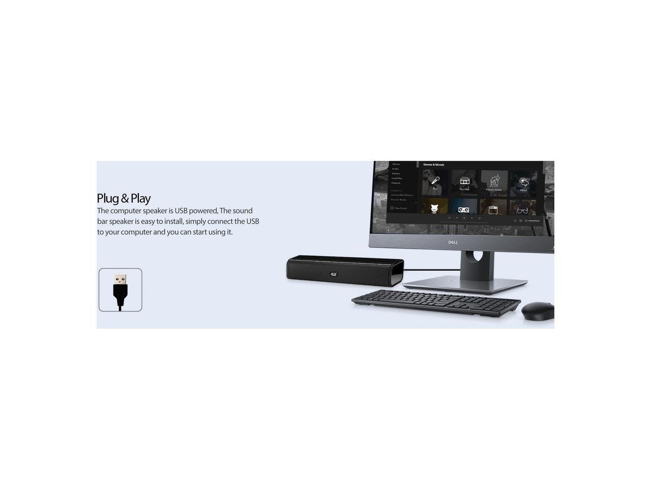 Plug & play - The computer speaker is USB powered, The sound bar speaker is easy to install, simply connect the USB to your computer and you can start using it.