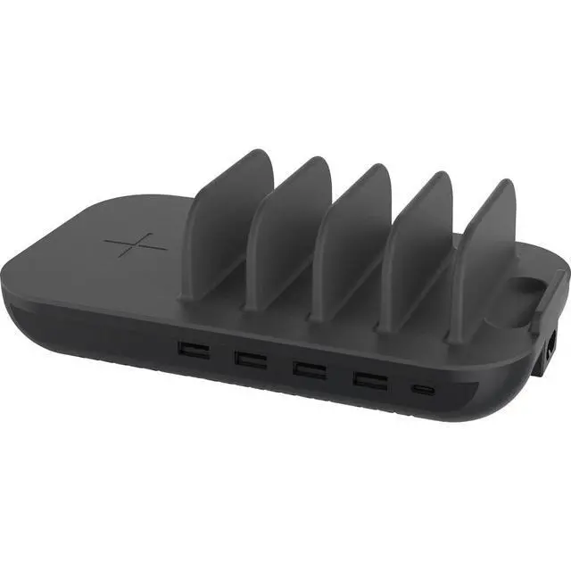 Desktop charging station features a wireless charging pad for a fast, convenient way to charge your device without directly plugging in. Five USB ports offer more options to power additional devices. Slotted design conveniently charges multiple devices simultaneously while keeping everything neatly organized. Integrated circuits with fast-charging technology offers a faster way to charge your devices. Advanced technology prevents overcharging, short circuits and overheating to keep your devices safe. Silicone, rubberized surface creates more friction to prevent devices from sliding.
