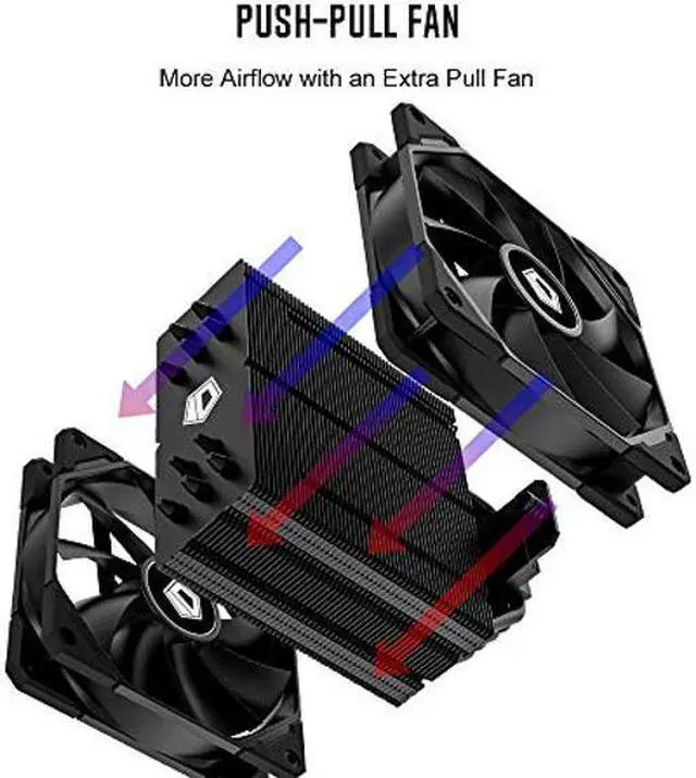[(Better Heat Dissipation)] The two cooling fans work in push-pull-configuration to ensure more airflow transported into the heatsink. Thereby, dissipating the heat from the CPU more efficiently than normal.