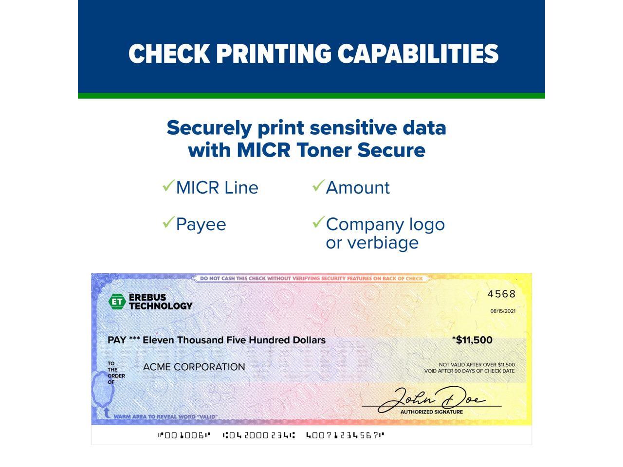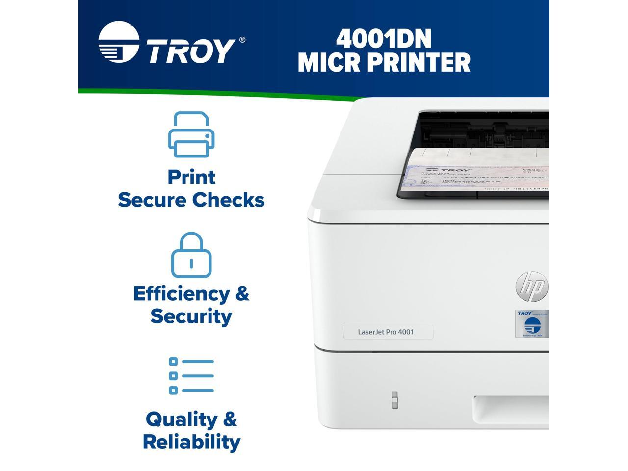 - Efficient Check Printing: The TROY 4001DN MICR Printer packs all the features you need for secure and rapid check printing making it an ideal choice for office environments. Print the MICR line payee amount and company logo with precision using black ink....