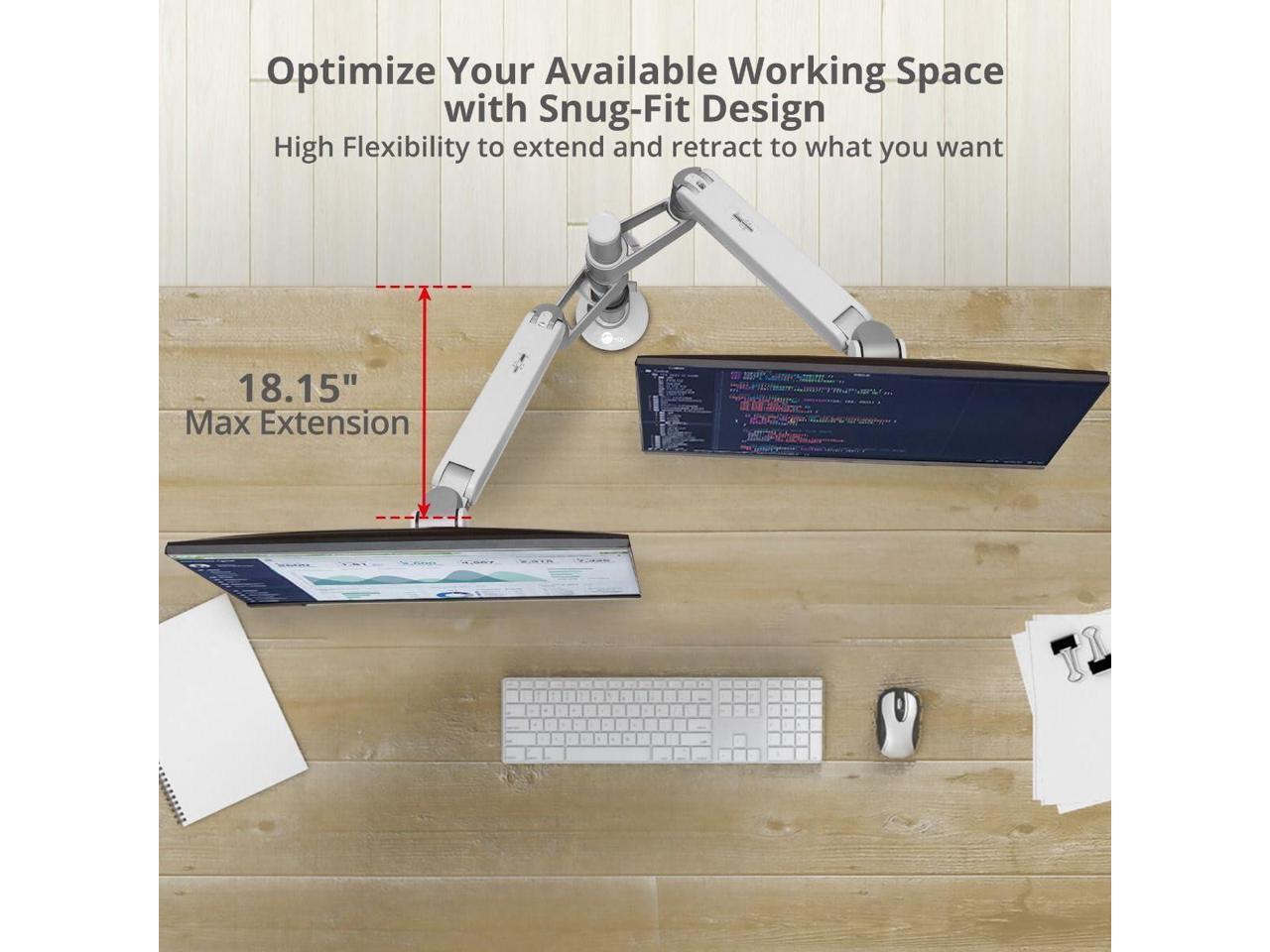 â?? Height and Depth Adjustments - This gas spring monitor arm allows for height adjustment of up to 19.65" from the base preventing ergonomic injuries by optimizing your viewing angle and reducing eye and neck strain. Extend up to 18.15 inches forward from the base providing ample space for your monitor to be positioned at the perfect distance to adapt to your needs.