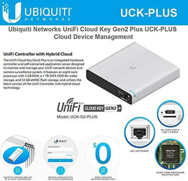 Manage your Unifi networking and video devices simultaneously with the new multi-application Unifi cloud key G2 Plus. Designed for easy deployment, The cloud key G2 Plus can be quickly configured over Bluetooth using the Unifi mobile applications. The front panel display shows vital system stats for your Unifi networking hardware and Unifi protect video cameras. A built-in battery provides protection against power loss. For video storage, It also includes a 1 TB HDD, which is upgradeable to 5 TB.