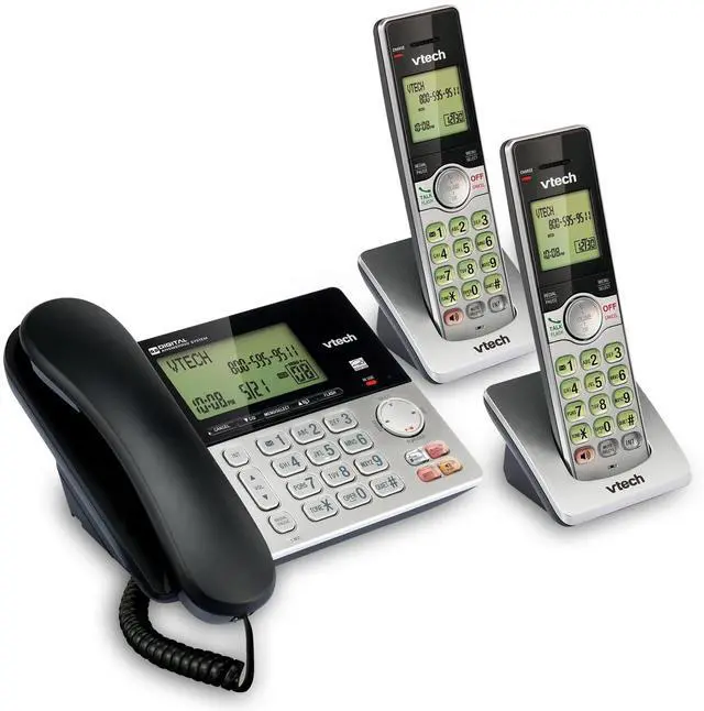 Complete with corded and cordless handsets the VTech CS6949-2 DECT 6.0 Expandable Cordless Phone with Answering System and Caller ID makes staying in touch easier than ever. The corded handset means you won't have to search for a missing ringing handset while the cordless handsets let you take calls into another room. A large backlit display on the base and built-in digital answering system make it easy to review missed calls. Using DECT 6.0 technology the VTech CS6949-2 DECT 6.0 Expandable Cordless Phone with Answering System and Caller ID gives you private interference-free sound from any room in your home.