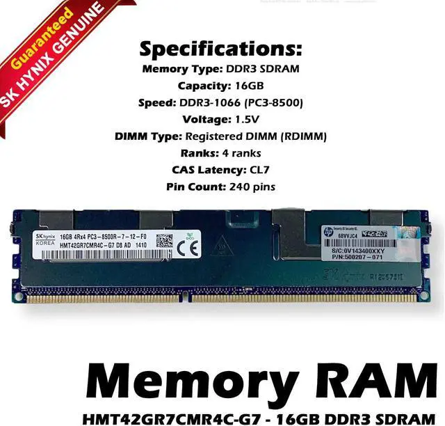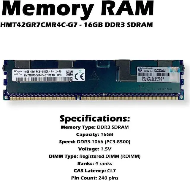 SK Hynix HMT42GR7CMR4C-G7 is a 16GB DDR3 ECC Registered DIMM (RDIMM) server memory module. Here's a breakdown of its specifications: