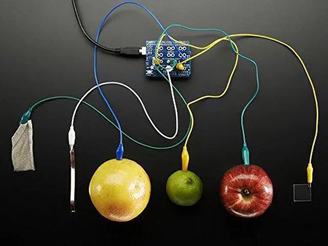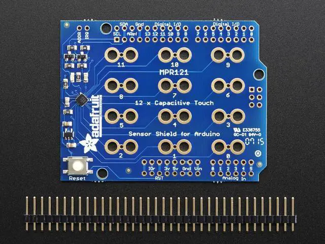 This touch-able add on shield for Arduinos will inspire your next interactive project with 12 capacitive touch sensors Capacitive touch sensing works by detecting when a person (or animal) has touched one of the sensor electrodes Capacitive touch sensing used for stuff like touch-reactive tablets and phones as well as control panels for appliances which is where you may have used it before This shield allows you to create electronics that can react to human touch with up to 12 individual sensorsThe shield has 12 figure 8 holes in it that can be gripped onto with alligator clip cables Attach one side of the clip to the shield and the other side to something electrically conductive (like metal) or full of water (like vegetables or fruit) Then start up our handy Arduino library to detect when the object is touched Thats pretty much it very easy For advanced users you can also solder to a pad to make a slimmer & more permanent connection Works great with any Arduino as it only uses the I2C pins (SCL & SDA) I t uses the same chip as our MPR121 12-Key Capacitive Touch Sensor Breakout so you can duplicate the library and code We have examples for reading touches Using an Arduino Leonardo and a little bit of creativity you can use it to turn touches into keyboard KeyUp/KeyDown presses (so you can make a veggie-keyboard) or pair it with our Music Maker shield to create an audio player that will play a sound per sensor (fruit drums)Each order comes with a Capacitive Touch Shield and a stick of 36-pin headers Youll need to do some light through-hole soldering to attach the headers onto the shield circuit board but its easy to do with basic soldering tools like a soldering iron and rosin core electronics solder Youll also likely want to pick up a 12 pack of alligator clips Please note This kit does not come with Arduino alligator clips or delicio