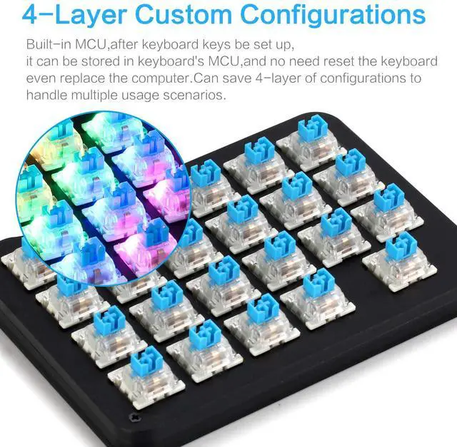 You can set up Normal/FN/FN2/FN3 4-layer configuration. Once set up, the 23-keys keypad will be converted into a 92-key keypad.