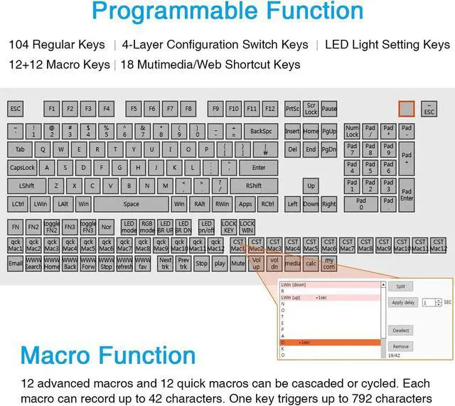 You can set up 12 advanced macros (with time delay) and 12 quick macros (without time delay). Each macro can record up to 42 characters. A total of 24 macros can be cascaded or cycled.