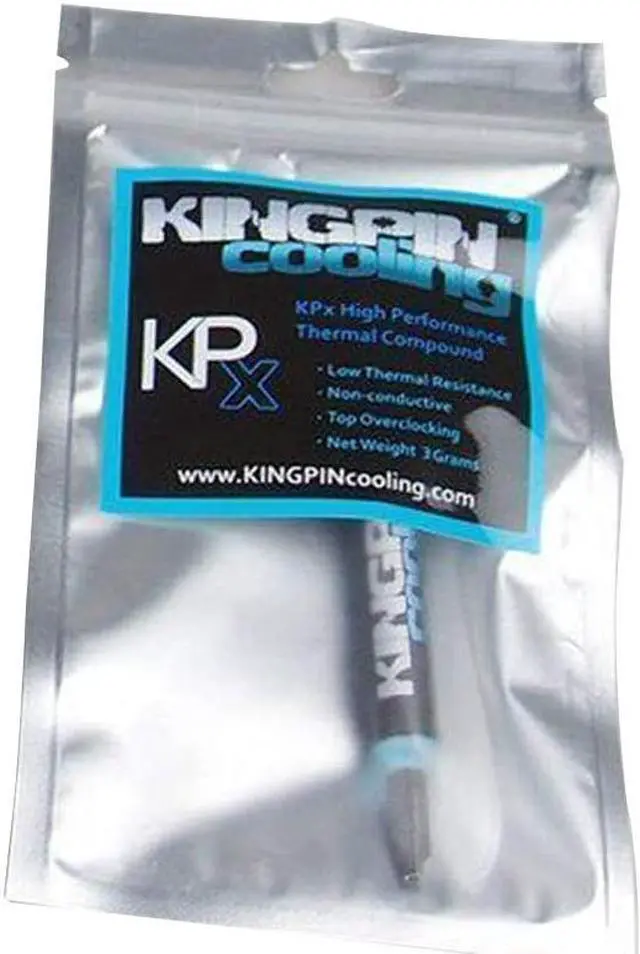 KPx High Performance Thermal Compound 3g syringe. This non conductive, low resistance thermal grease is designed and validated for a wide range of cpu and gpu overclocking from air cooling, water, dry ice, or all the way down to liquid nitrogen temperatures. This version is 3G size and comes packed in a convenient 3G syringe with included spreading spoon.