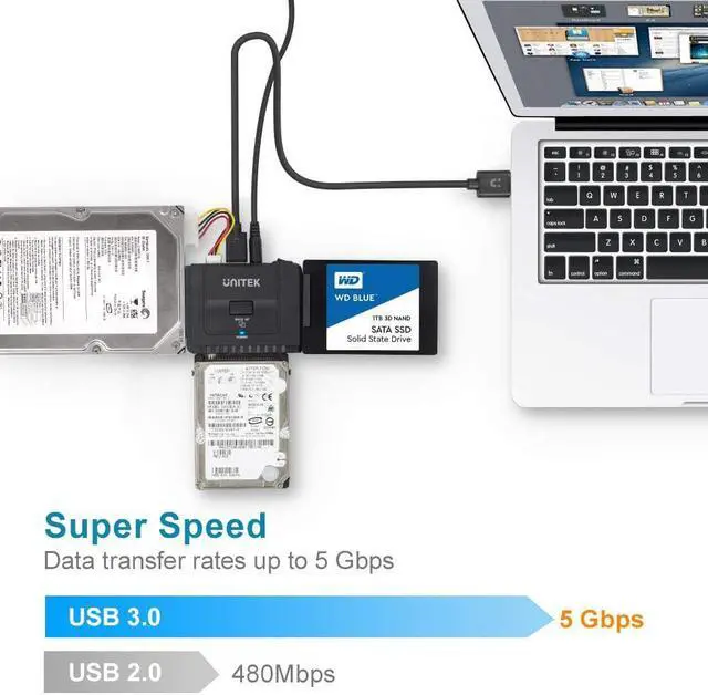 Kindly Remind: - One-click backup (OTB) feature to effectively secure precious data; The OTB Software CD is installed for the One Touch Backup. (OTB doesnt work on Mac OS and Linux) Since 2006, Unitek has designed and manufactured human friendly tech products and accessories for more than 30 countries. We build products to cover the many dimensions of human experience. Friendly in our relationships, our products, and we strive to make the world more friendly each day. UNITEK USB to SATA IDE Hard Drive Adapter Packaging - 1 x USB 3.0 to IDE+SATA Adapter - 1 x USB data cable 3.0 - 1 x 4PIN power cable - 1 x 12V 2A Power Adapter - 1 x OTB Software CD Hot SwapPlug and play. One Touch Backup function.