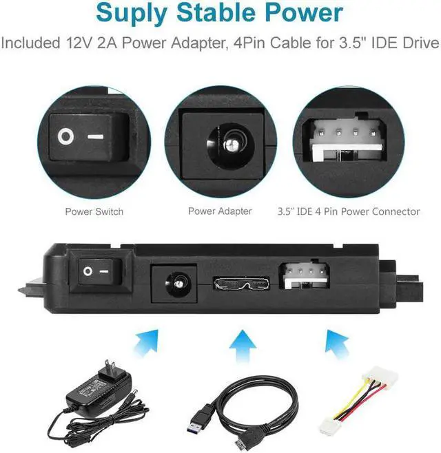 Included 12V 2A power cable is for providing stable electricity supply. 4PIN Power Cable is designed for 3.5 IDE drive.