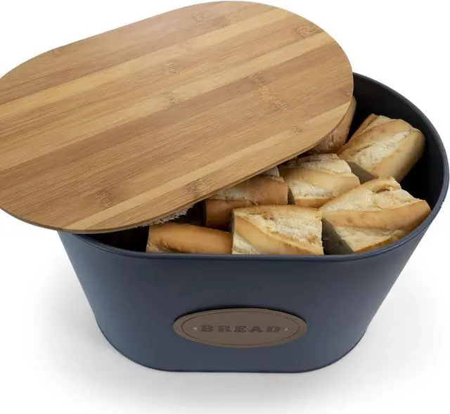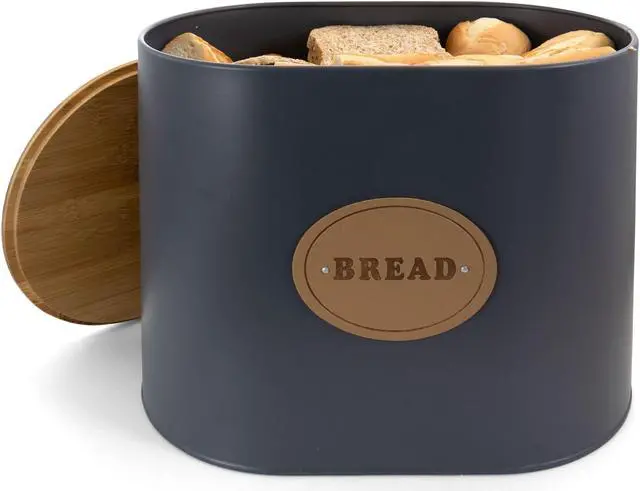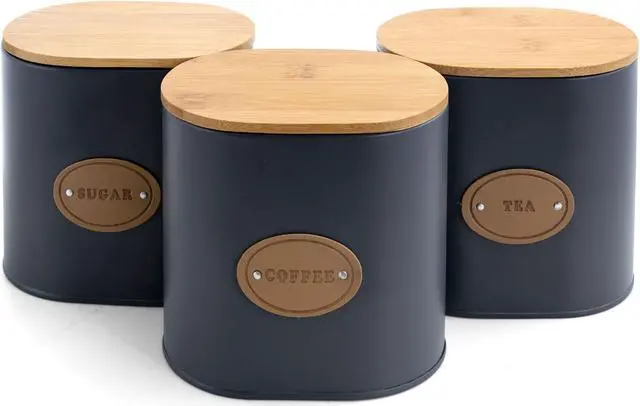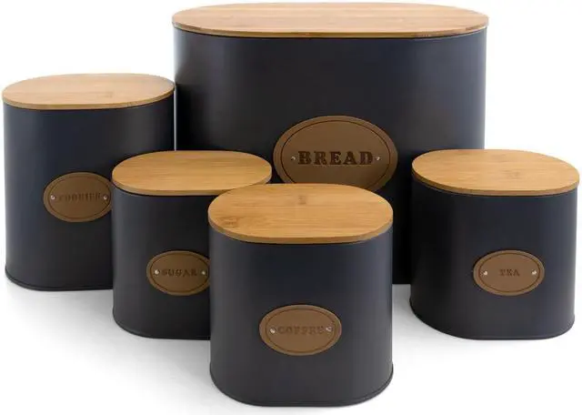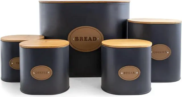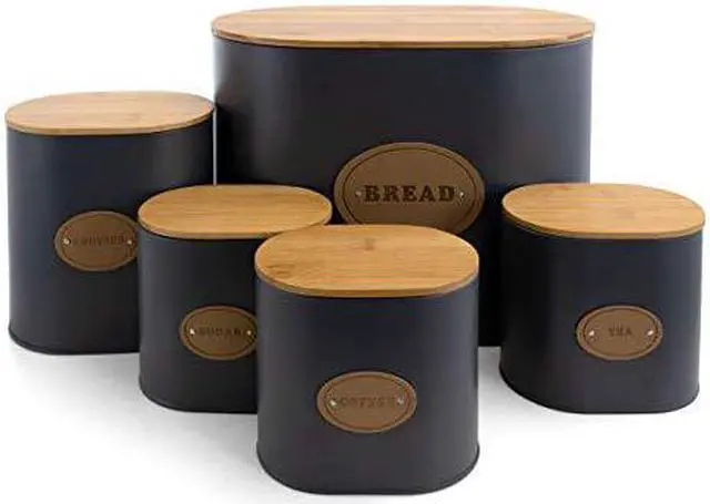 Preserve the freshness and quality of your food with the MegaChef Kitchen Food Storage Organization Canister Set. Featuring pull style handle lids and labeled badge, this storage set is ideal for any kitchen. Ensuring your food will be kept fresh for weeks to come, each canister is crafted of metal with a gray finish throughout and can hold up to 5.5 cups of your favorite coffees, teas, and sweeteners. Bread and cookie storage canister is also ideal for keeping your fresh breads just as fresh as the day you put them in and your cookies nice and crunchy. Each container has a matte gray finish and is labeled for your convenience. Bamboo lids on each canister is easy to care for, wipe clean when needed. The lid on the bread box also serves a dual function, use it as a cutting board and a serving tray. This MegaChef Kitchen Storage and Organization 5 Piece Canister Set was conveniently designed with you in mind.