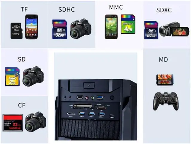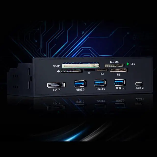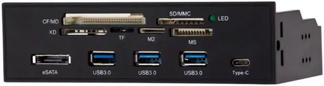 Specifications: High compatibility, all-in-one card reader supports most available cards, for SD/CF/TF/SDHC/MMC/SDXC/MD cards. Support eSATA and type-C transmission. Front panel installed, easily refit your PC case.