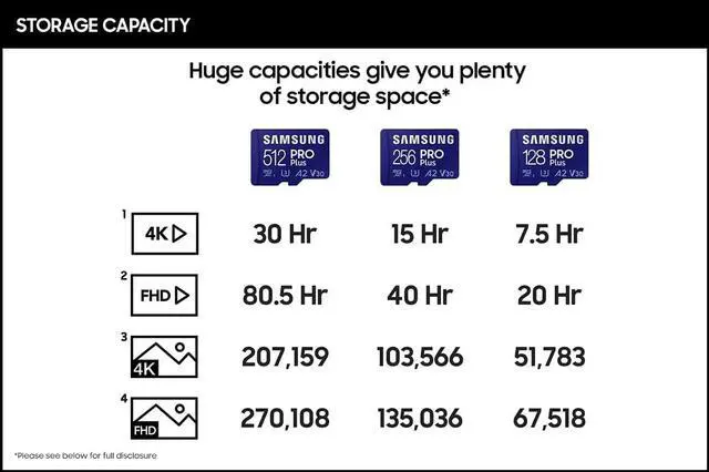 Your new go-to card + adapter combo the Micro SD PRO Plus + Adapter makes capturing seamless 4K video on compatible phones or drones a breeze. Plus the expanded storage provides you the freedom to play more high performance and intensive games on your tablet or gaming device. Its all the extra space you need from a brand you can count on. *Requires a compatible phone or drone capable of filming 4K video. **Comparisons based on 2020 PRO Plus microSD models. ¹The foregoing read & write speed performance is based on testing of 512GB capacity under standard conditions; Actual speeds may vary depending upon card capacity; ² Stated performance is achieved by using PRO Plus microSD cards with Samsung adapters ***Waterproof: withstand up to 72 hours in seawater; ****Temperature proof: operating temperatures of -25 C to 85 C; non-operating temperatures of -40 C to 85 C; *****X-Ray Proof: up to 100mGy equal to airport X-ray machines; ******Magnetic-Proof up to 15000 gauss or the magnetic field equivalent of a high-field MRI; *******Drop: withstand drops up to 5meters (16.4 feet). ********Wearout: up to 10000 swipes. *********Source: 2003-Q3 2020 IHS Markit data: NAND suppliers' revenue market share.