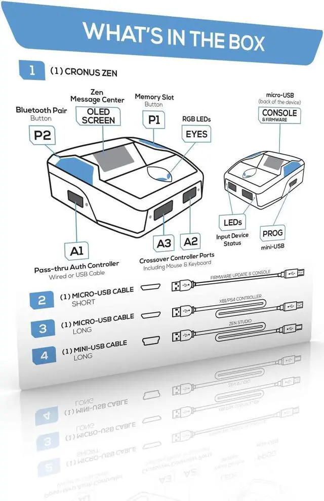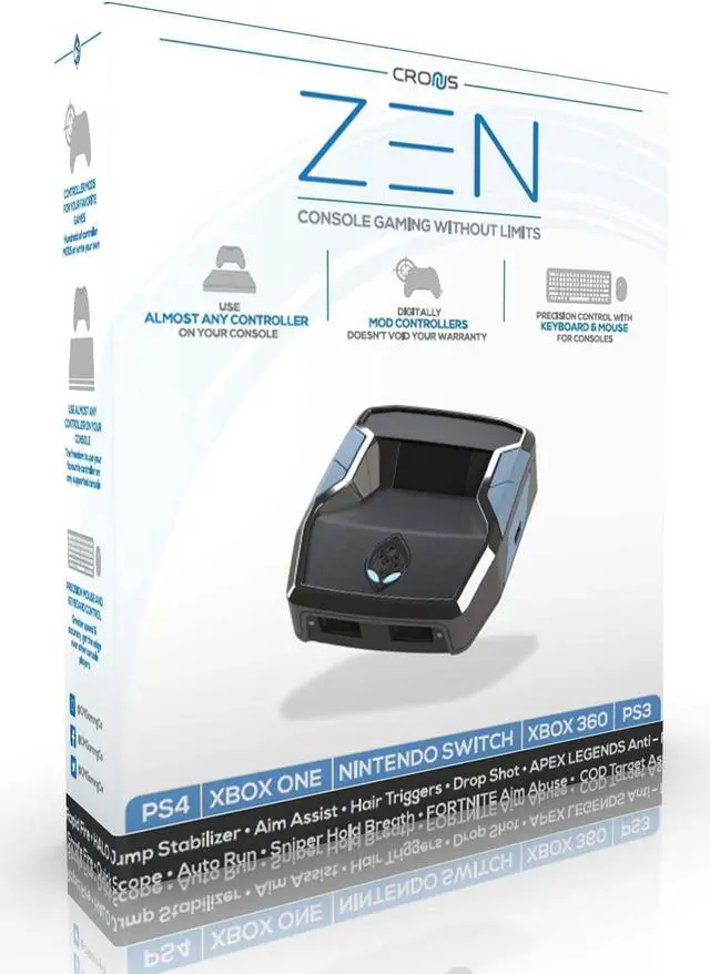 Cronus Zen is a breakthrough device founded on the rich legacy of the award-winning CronusMAX devices universally recognized as the definitive controller adapter. Zen moves that legacy forward giving the gamer the most powerful platform on the market allowing advanced crossover platform gaming technology unparalleled keyboard and mouse precision combined with unsurpassed MOD scripting capability of combos and macros with the new Zen Studio software. Cronus Zen unleashes the true power of your controller unlocking more features than ever before. Re-designed from the ground up you now have access to powerful modes such as Crossover Gaming which allows you to use your favorite controller on PS5 BETA XBOX SERIES X|S BETA PS4 XBOX ONE NINTENDO SWITCH PS3 XBOX 360 and WINDOWS PC. It also converts your controller into a fully loaded war machine without installing any chips or wires. There are thousands of free MODs developed by the Cronus Community for all the latest games including Rapidfire Anti-Recoil Aim Assist Aim Abuse Quickscope Strafe Shot Drop Shot Fast Reload Auto Sprint Sniper Breath Steady Aim and much more - without spending hundreds of dollars on an expensive modded controller