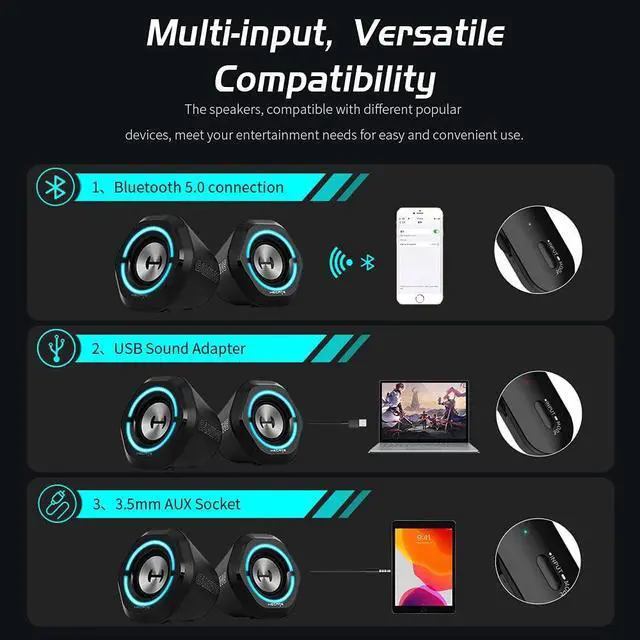 The Wired Control for Easy AdjustmentThe gaming speakers for PC with its easy wired control offer user-friendly experience by controlling the volume lights effect gaming or music mode and the 3 input modes like USB sound adapter input 3.5mm AUX input and Bluetooth 5.0 input. With different colors indicators you can clearly know what the mode it is.