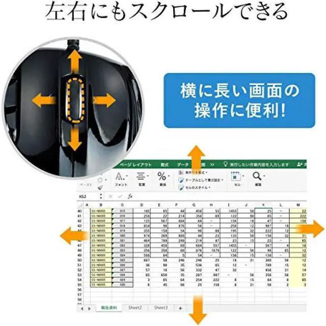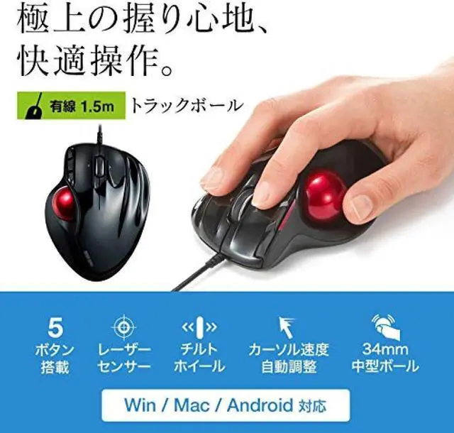 • Interface:USB HID specification Ver.1.1 compliant *Can also be used with USB3.1/3.0/2.0 interface.;Connector shape:USB(A connector);Resolution]: 400, 800, 1200, 1600 counts/inch;Reading method]: Laser sensor method;Button]: 2 buttons, 2 side buttons, wheel (scroll) button, count change button;Size:W100×D131×H45mm;Weight:About 154g;Cable length:1.5m