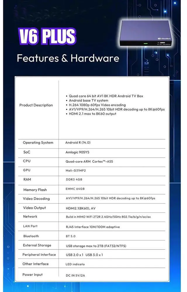 The V6 Plus is a next-generation flagship model designed with a completely new structure and powered by the high-end Amlogic S905Y5 chipset.