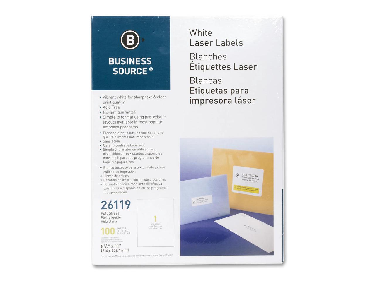 Business Source Mailing Labels Full Sheet Laser 8-1/2"x11" 100/PK White 26119