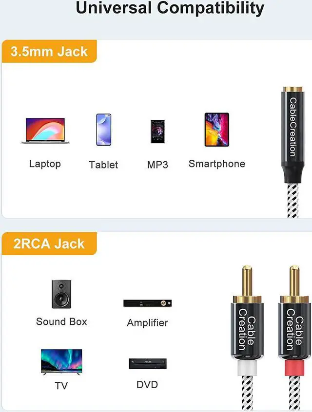 What You Get: CableCreation provides worry-free two years warranty and lifetime friendly customer services. Package including 1-pack 3.5mm female to 2 RCA male audio cable.