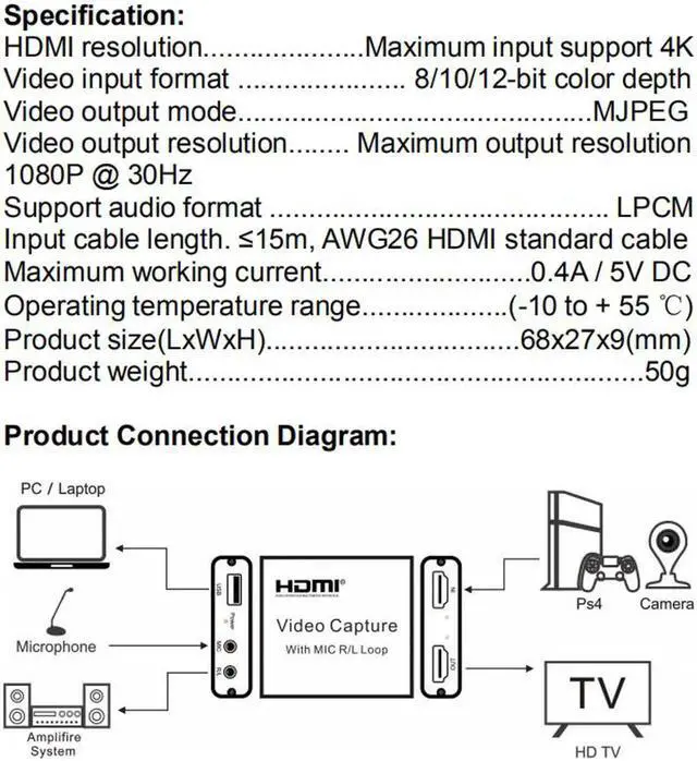 The video capture can capture both HDMI video and HDMI audio, sending audio and video signals to computers and smart phones for preview and storage. Also can push to online live platfroms to live at the same time, Suitable for HD acquisition, teaching live streaming, game live streaming, Study video capture, Films capture etc.