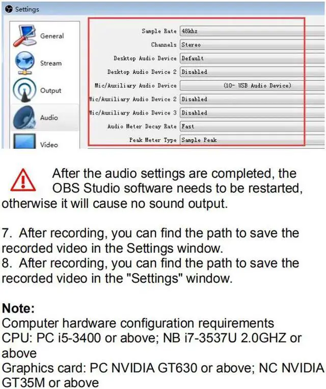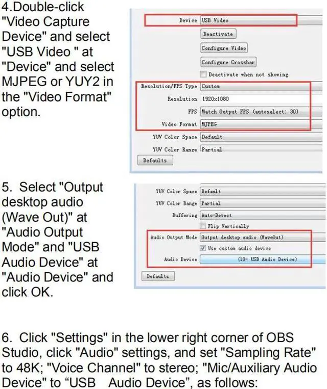 4. Operation steps for USB video capture(OBS): Open the software?Choose sources of Video capture Device?Set the size of image?Choose Studio Mode(double window)?Choose Start Recording.