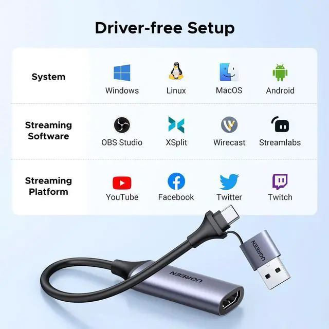 UGREEN video capture card is connected to the input device through the HDMI port, and transmitted to the output device with the USB-A/Type-C interface for living broadcast and capturing. It is widely used in HD acquisition, teaching recording, live streaming, medical imaging, online meetings, etc.