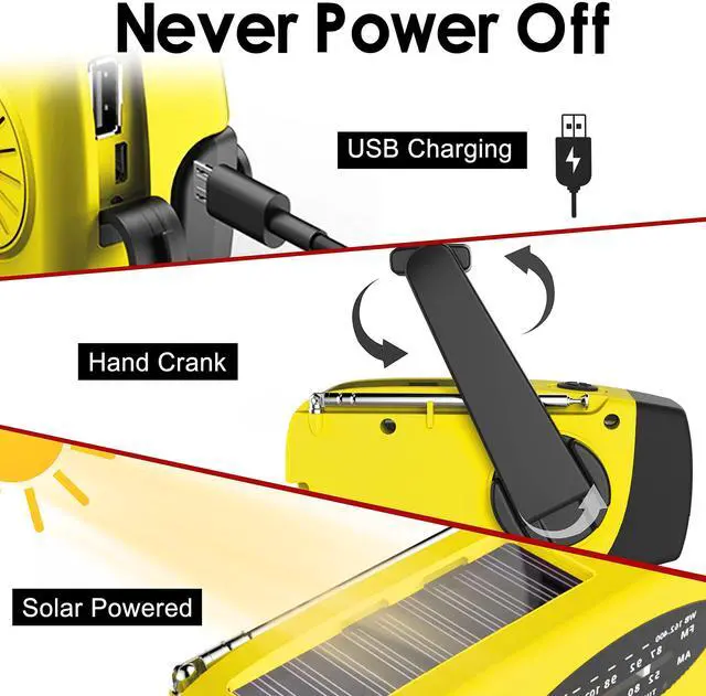 3-WAY POWER SOURCESThe solar crank radios with multiple power backup options are the best choice in an emergency package. With 3 power sources including hand crank, solar panel, and built-in rechargeable battery, it makes it easier to keep the emergency radio running during prolonged situations where power is off and batteries have been used up. Never face a power outage!