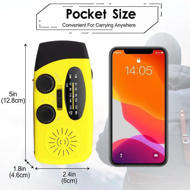 PORTABLE RADIO WITH FLASHLIGHTThis pocket-sized portable emergency radio has dimensions of 5 x 1.8 x 2.4 inches and weighs 0.5 LB, making it surprisingly small and light. It also comes with a 1W LED flashlight, which will cut through the blackness and maximize visibility. Carrying around a large unit is quite difficult when you have to mo