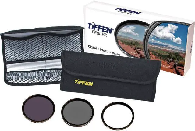 All of the standard filters for your digital SLR or Video Cameras. This Filter Kit Includes consists of a UV Protector, Circular Polarizer, Neutral Density 0.6, Four Pocket Filter Pouch and a Tiffen filter guide. A UV protector filter is an important addition to your lens. Not only does this filter absorb excess UV light, but it also adds protection to your lens and can be left on at all times. Circular polarizers cut glare and reflection from non-metallic surfaces giving deeper colors. The neutral density 0.6 eliminates overly bright washed out skies and helps balance over exposure.
