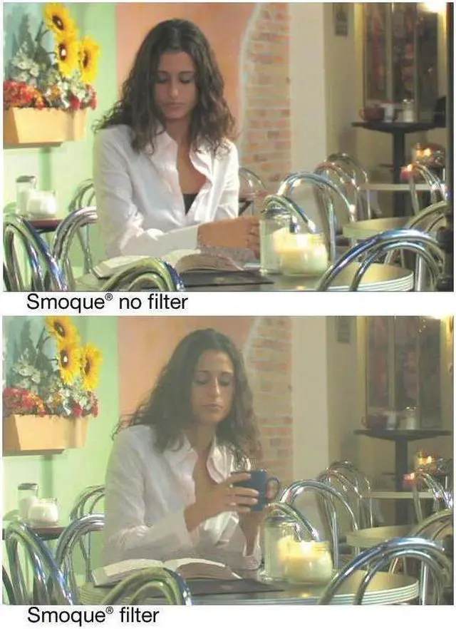 Mechanical smoke generators are often used to enhance realism where smoke is normally encountered. This can be difficult, costly and less desirable to work in a smoke-filled environment. The Smoque Filters create the look of smoke without the cost and hassle of smoke generators.