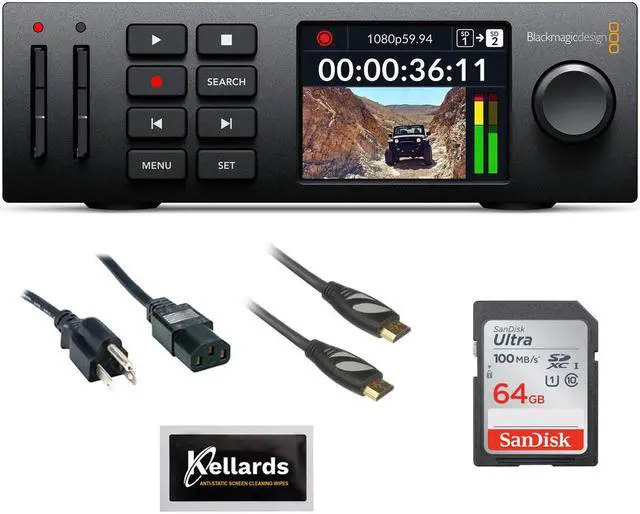 Blackmagic Design HyperDeck Studio HD Mini Kit. The 1 RU tall recorder is 1/3 of a rack wide and powers from 100 to 240 VAC, or via an optional 12 VDC power supply for portability. Featuring one 3G-SDI input, one each HDMI and 3G-SDI output, and a USB Type-C webcam output, the recorder is flexible, enabling you to input, record, and output/stream simultaneously. Supporting both reference and timecode in/out, this unit fits perfectly into a broadcast environment, and you can use one recorder to create an ISO recording of each camera with perfect sync for live and post-production work. Two SD card slots allow you to capture with virtually unlimited recording time, and the unit also supports recording to USB disks via the USB Type-C output port. The HyperDeck Studio HD Mini features a front-panel button control and a jog/shuttle wheel for an analog scrubbing feel. RS-422 control is supported for external control, and you can also control the unit using either the USB port or over Ethernet at 1G speeds for faster deck control and file transfers via the RJ45 connector. An integrated LCD on the front panel allows you to monitor the video.